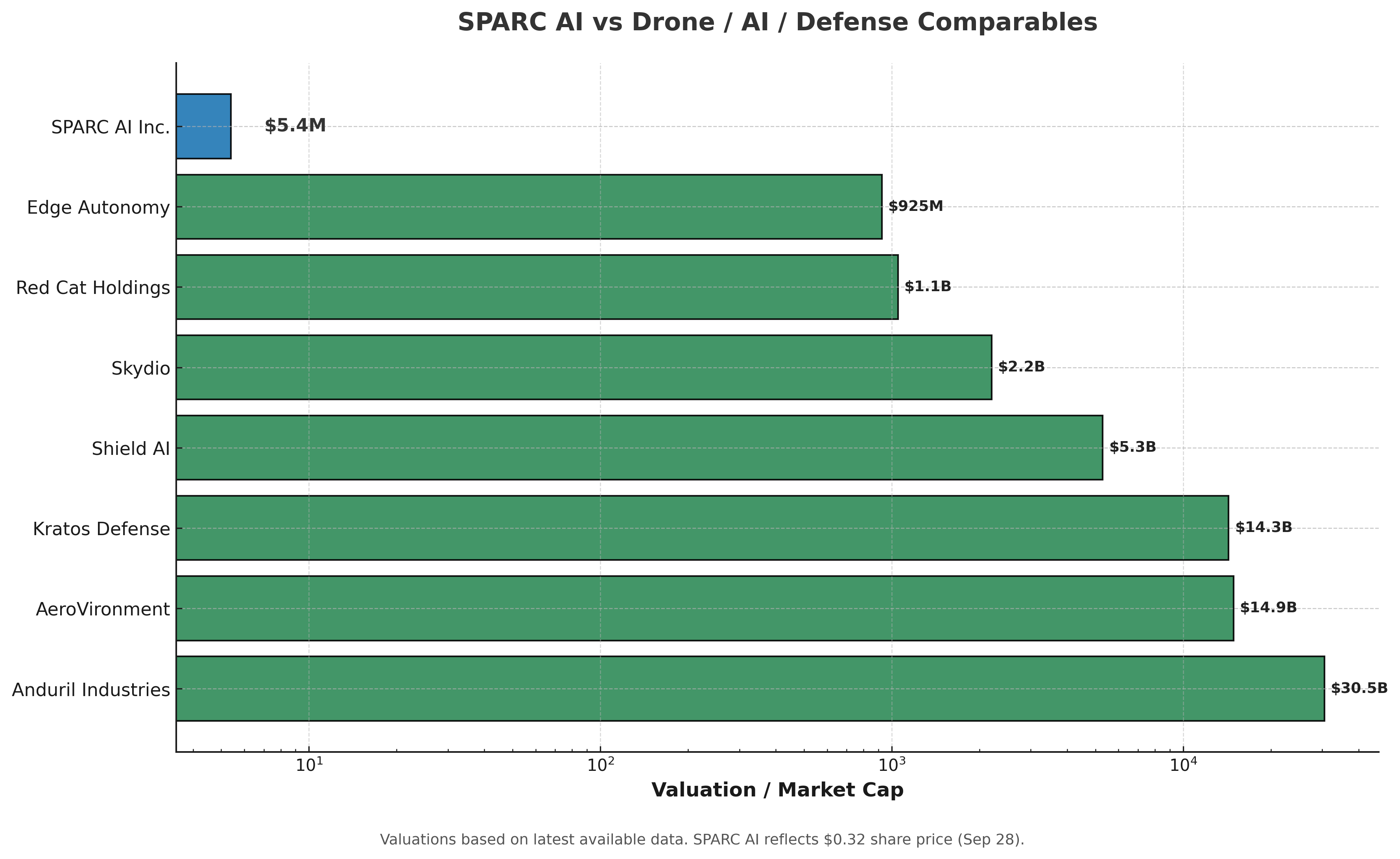 Despite already climbing more than 300% since going public, SPARC AI (OTCQB: SPAIF / CSE: SPAI) still sits at a microscopic market cap of roughly $5 million. To put that in perspective, Kratos trades around $14 billion. AeroVironment is worth about $15 billion. Private defense darling Anduril is valued at over $30 billion. SPARC AI (OTCQB: SPAIF / CSE: SPAI), by comparison, barely registers. That’s not just "undervalued" — it's invisible.